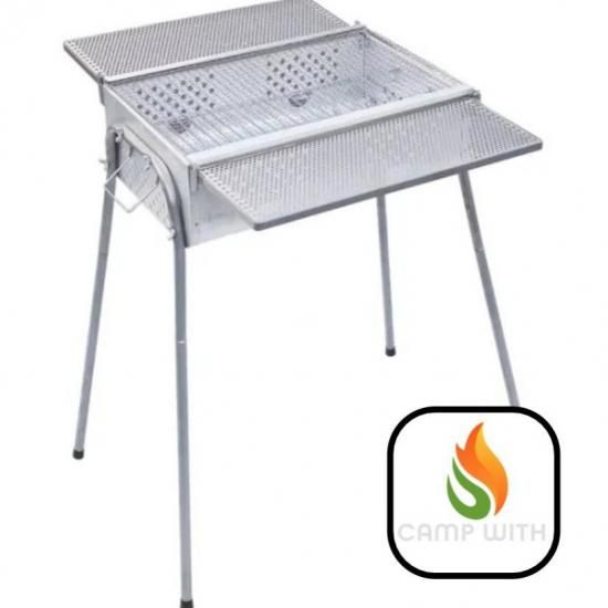 広げて使える折り畳みのテーブルがついた組み立て式のグリル。テーブルは、食材や食器などを一時的に置くのに便利。※長時間物を置いたままにするとコンロの熱で食器などが変形・溶けたりする恐れがあります。 本体のグリル以外に、バーベキュー網×1、ロストル(グリルや焚き火台に敷いて炭などを載せる耐久性の高い網)×1つき。