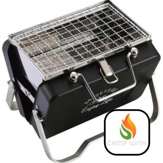 〇ソロキャンプやお花見・行楽に最適なコンパクトサイズのV型卓上グリル。